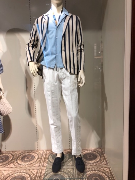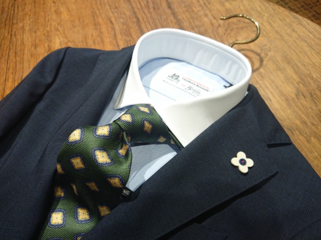 ご覧のように、イージーとは申しましても、タイドアップもバッチリです。クレリックシャツにグリーンのプリントタイのコーディネート、新緑の季節をイメージさせる爽やかさを意識してみました。