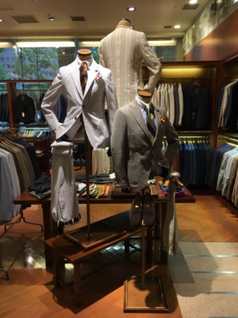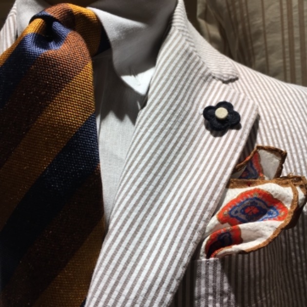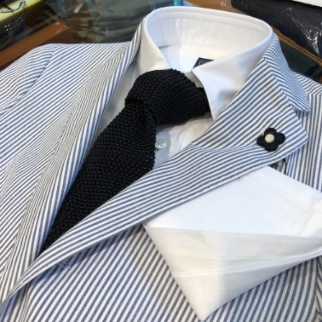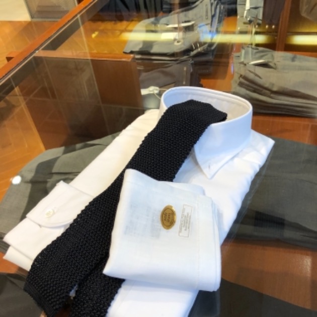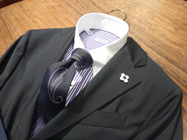 パープルのクレリックシャツや、ブラックベースのペイズリーネクタイ等、旬のお品を加えてみました。