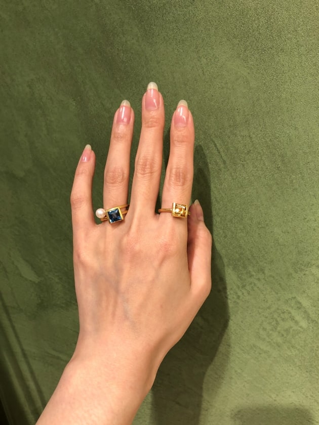 右手は高貴な色のアメジストのリング、、左手は幸福をもたらすレインボームーンストーンの別注リング。ファッションとしてはもちろん、なんだか力がみなぎるパワーストーン。キラッと光る手元は見るのが楽しくなりそう。