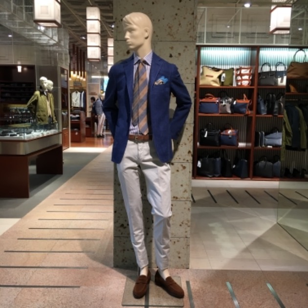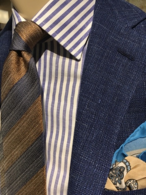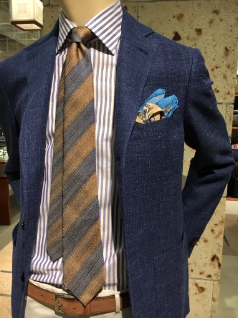 毎シーズン好評のフィレンツェモデルに<Joshua Ellis>のカシミアを載せています。サマーカシミアならではの独特のヌメリ、光沢、肌触り、最高です。触った感じは通年着用しても違和感なさそうでした(ヘビーユースはオススメしませんが)。
