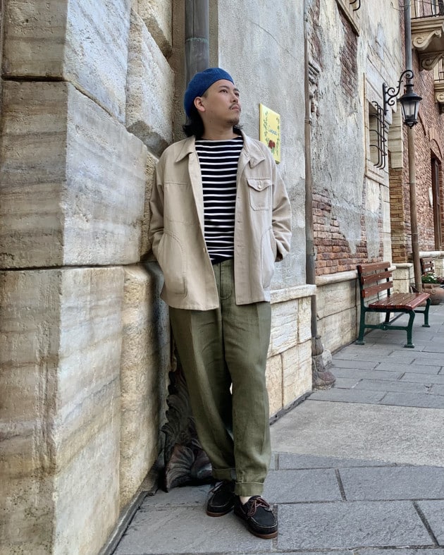 別注<ASPESI>のダウンベストに<BEAMS F>シェットランドニットを合わせたコーディネート。写真ではわかりにいくですが、ブラウンのダウンベストにパープルのシェットランドニットの色合わせが洒落た色気のある雰囲気を醸し出します。