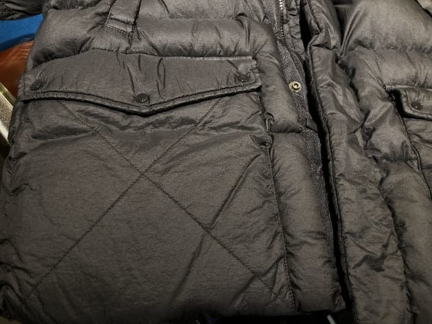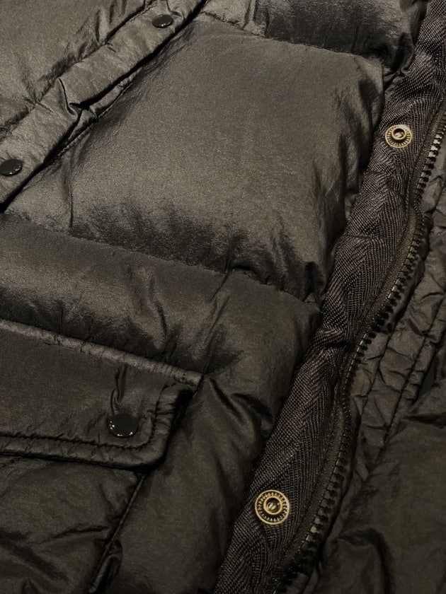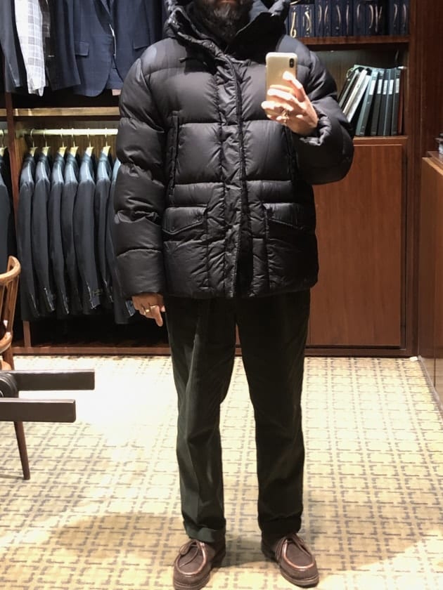 形は、王道のやや着丈があるダウンジャケット型ですが、腰ポケットのステッチがさり気なく効いていたり