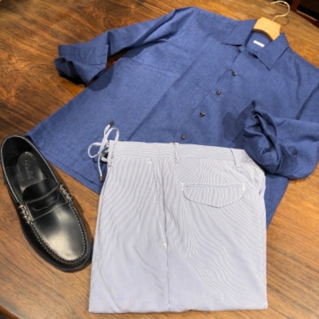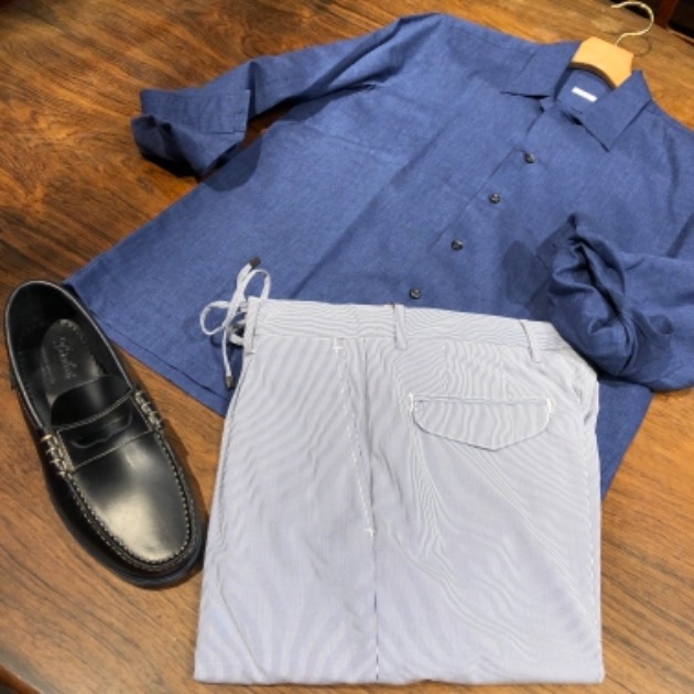 スエードのローファーも、かなり軽い部類のシューズではありますが、ショートスリーブにショートパンツの組み合わせなので、更なる軽さが欲しいところ。