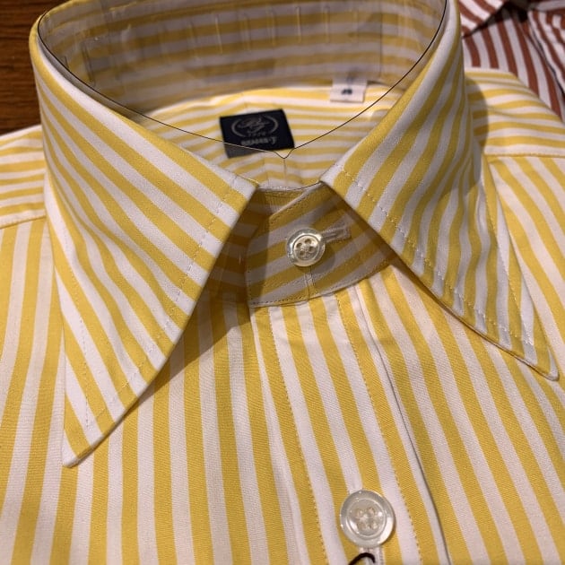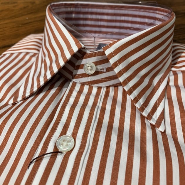 フロントボタンが隠れる尾翼仕様で、ロゴが同色、台襟付きのモデルです。