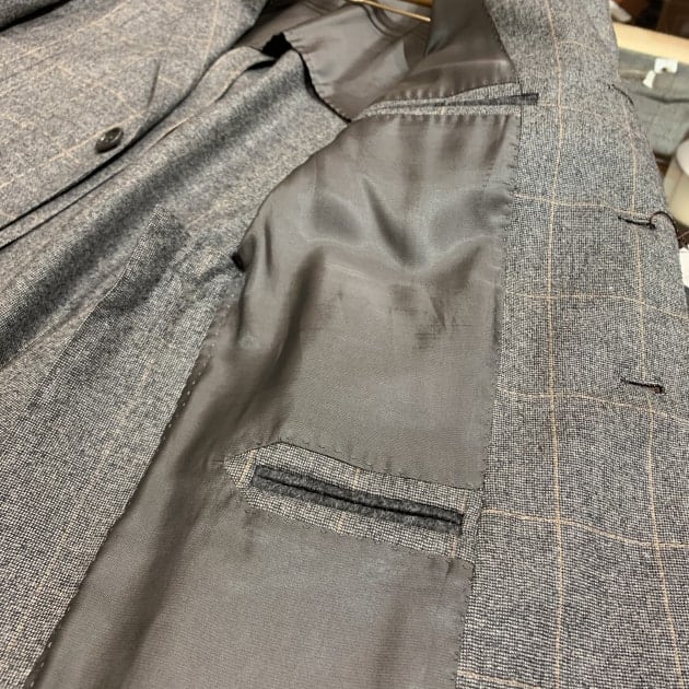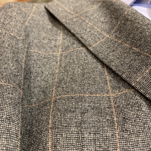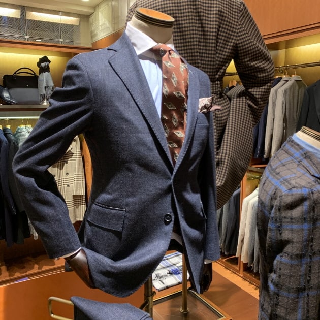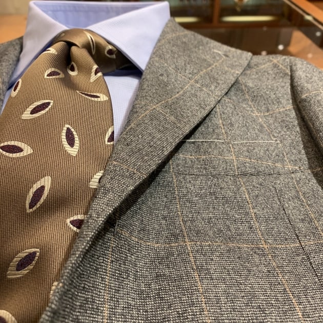 お陰様でご好評頂きまして、ネイビーのグレンプレイドは当店在庫サイズ46のみとなりました。お取り寄せでご用意できるサイズはまだ若干数あると思いますので、スタッフまでお問い合わせください。本日は他の生地モデルをピックアップします。