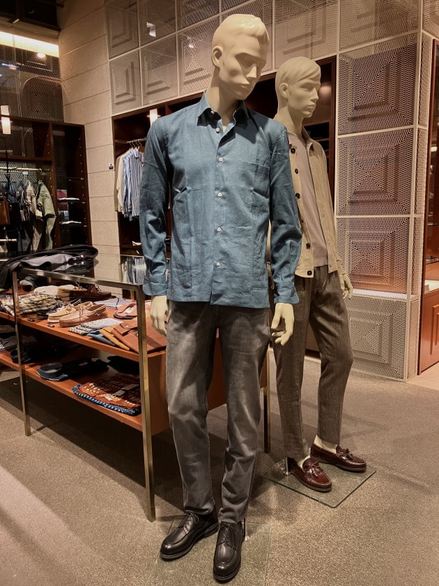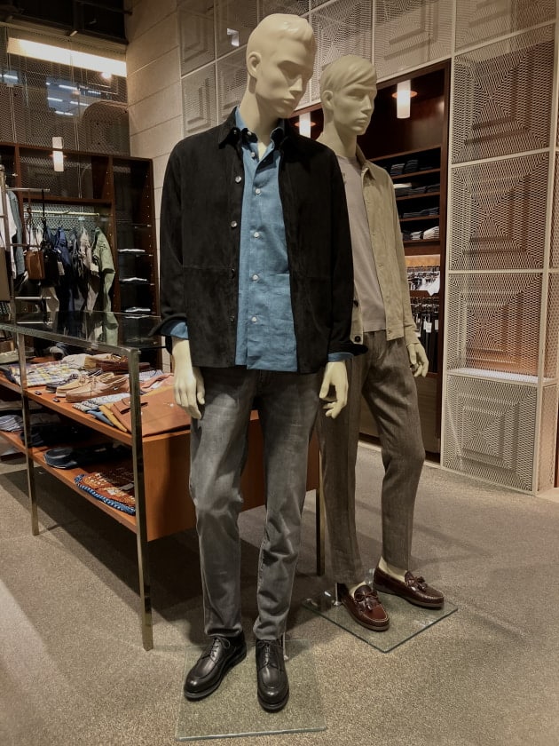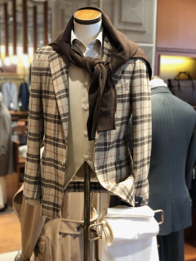 ベージュのツイル地に濃淡をつけたグリーンがいいですね。コーディネート次第ではブリティッシュにもフレンチにも使えます。