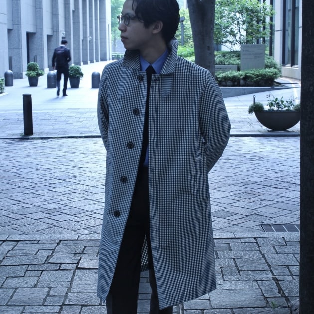 そしてスタッフ日高が着用するのは『BOWLANDボウランド』。比翼仕立てのコートです。ガンクラブチェックにピンクのニットが映えますね。