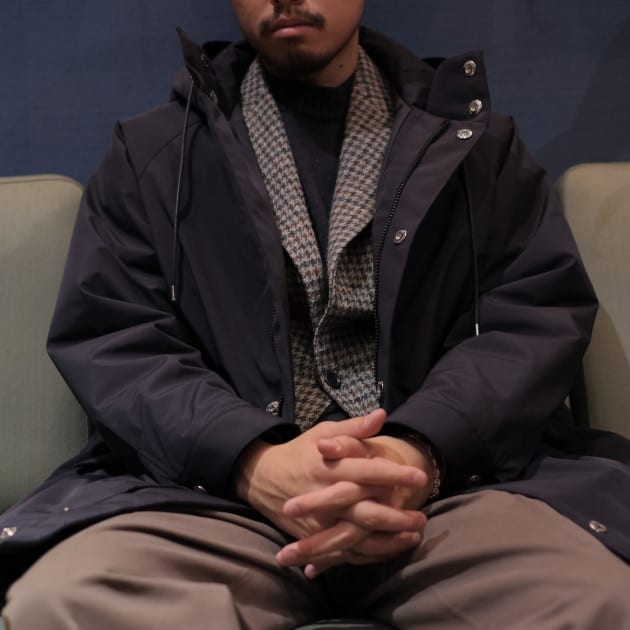 こちらも9月から仲間入りしましたスタッフ阿部が『SANQUHARサンクハー』 のケープコートを着用。