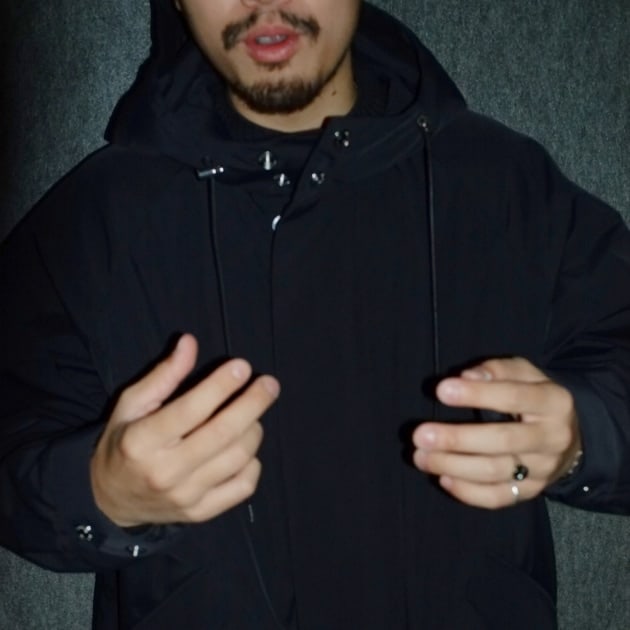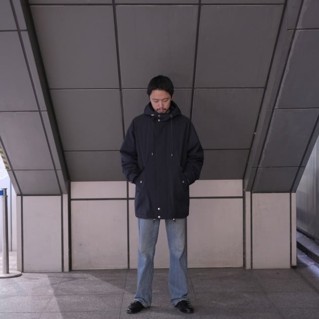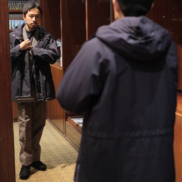 わたくし松元は『LAGGANラガン』を着用しました。英国の陸軍が着ていたバイカーズコートをイメージした、新型です。