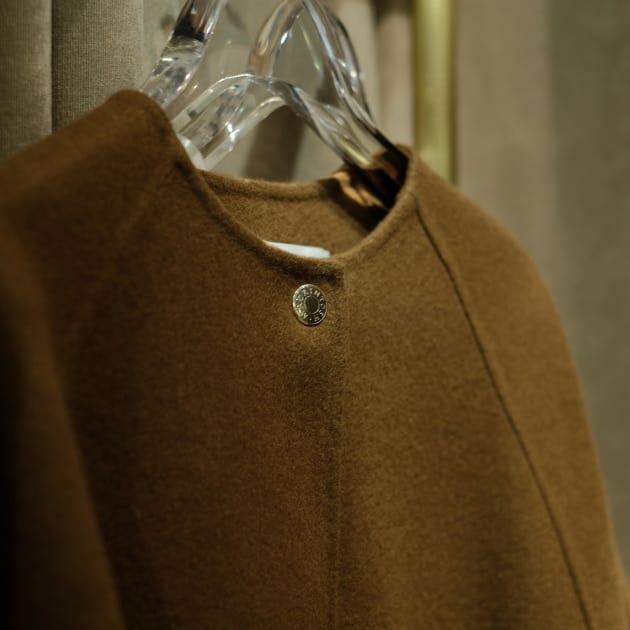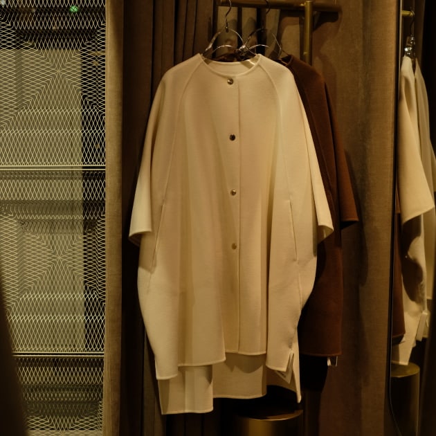 着丈が長く、メンズライクなムードながらも梳毛ウールギャバジンの落ち感が女性的です。バサっと着る感じが気に入っています。