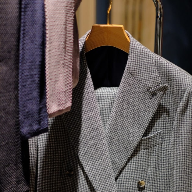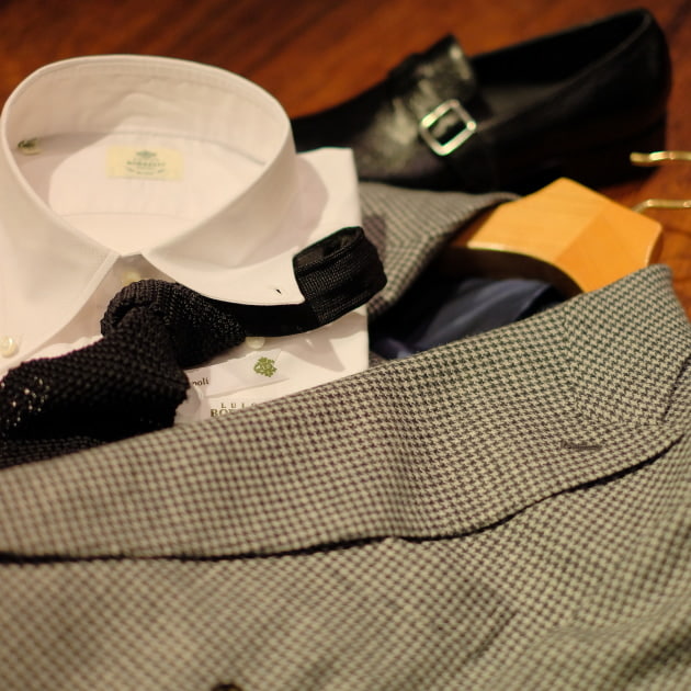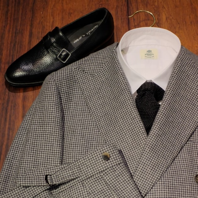 この様なテイストのスーツを着用する際は、ニットも良いですがシャツを着用するとちゃんとしている感が出ませんか?