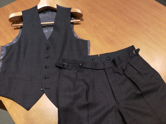 生地はHieldのチャコールグレー、ピンスト。ウール100%。