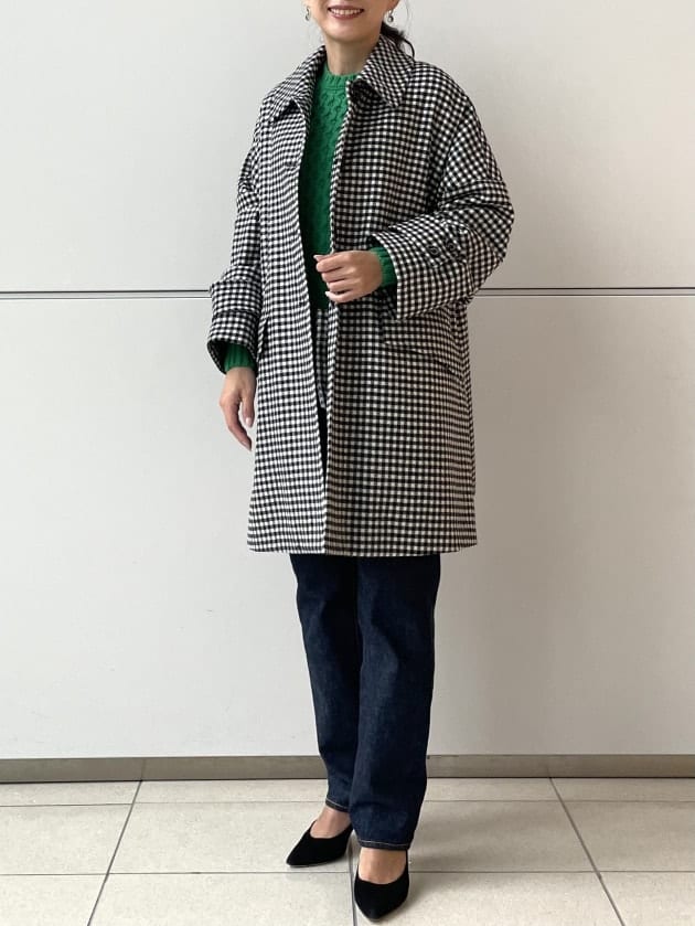 しっかり着丈で、身長158㎝の私でふくらはぎ丈。このように、ワイドパンツや丈の長いスカートと合わせてもOK。