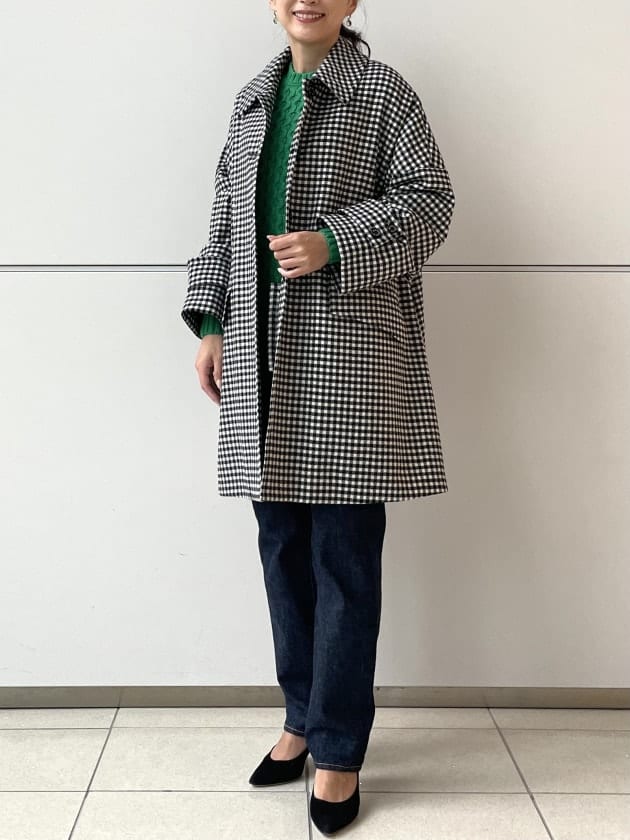 高い位置にボタンがあり、長い丈もバランス良く着られます。