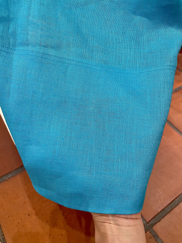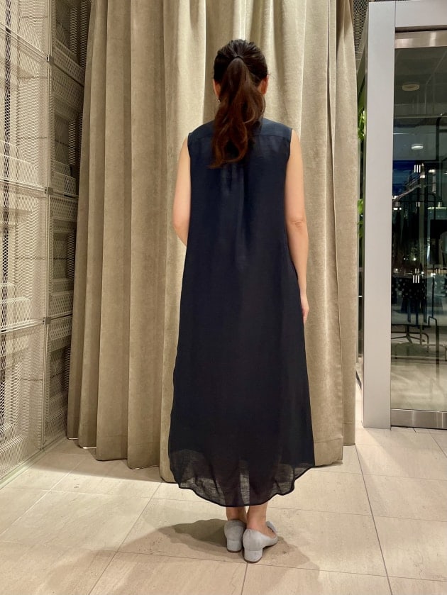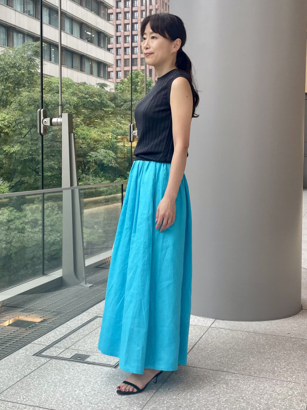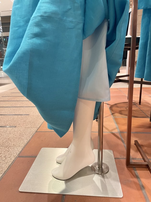 シルエットはぴったりせず、裾に向かってAラインに広がっています。