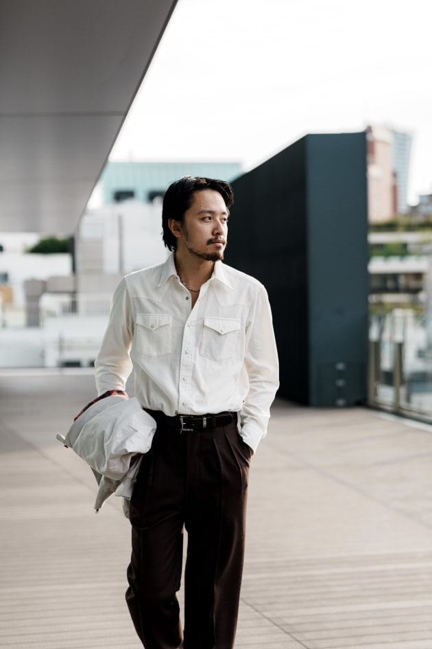 <SUPPORT SURFACE>のグレージュカラーのリネンパンツを合わせれば、トーンコーディネートでレザーの重みなく、軽やかな雰囲気にまとまります。
