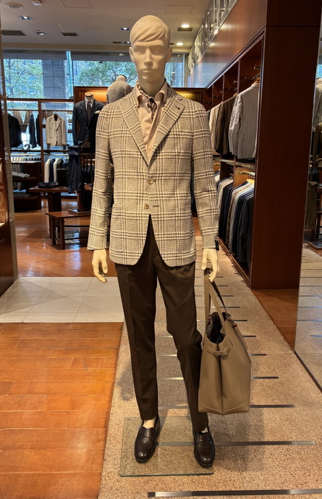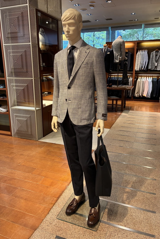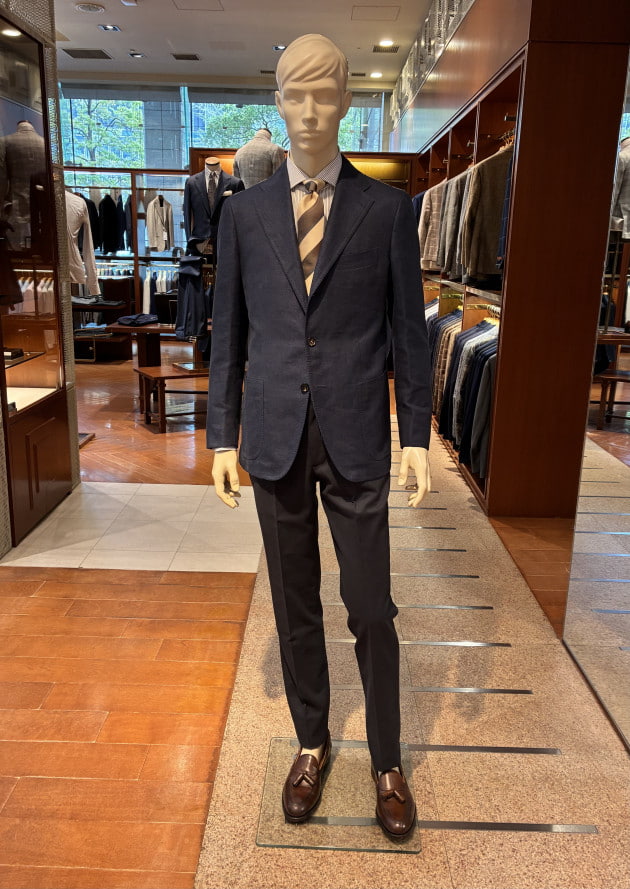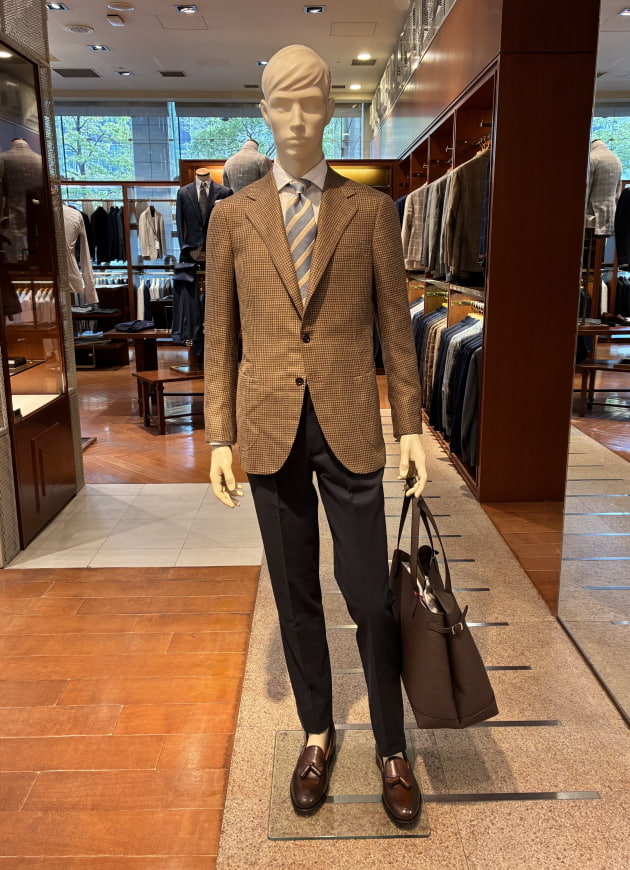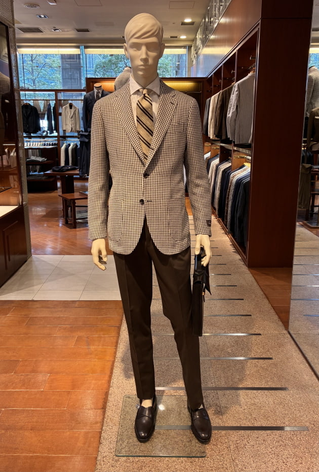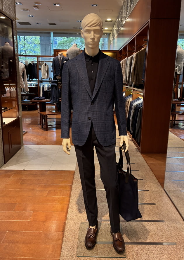 こちらは店内のディスプレイで使用していた上半身をそのまま流用しました。ディスプレイはウールのグレースラックスでしたが、爽やかな色柄のジャケットにはコットンのネイビースラックスも良いと思います。