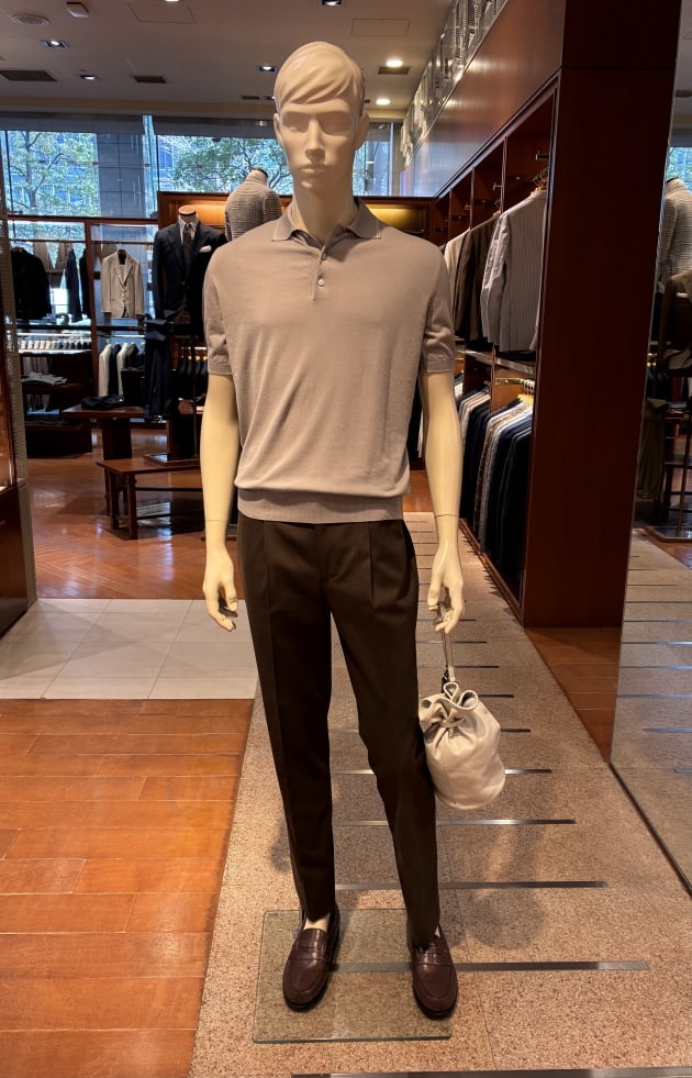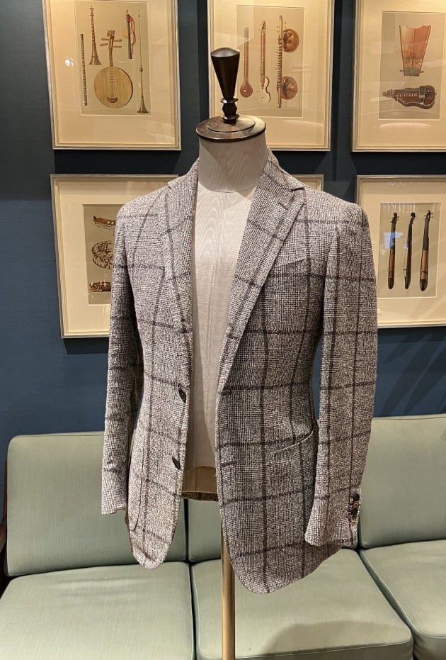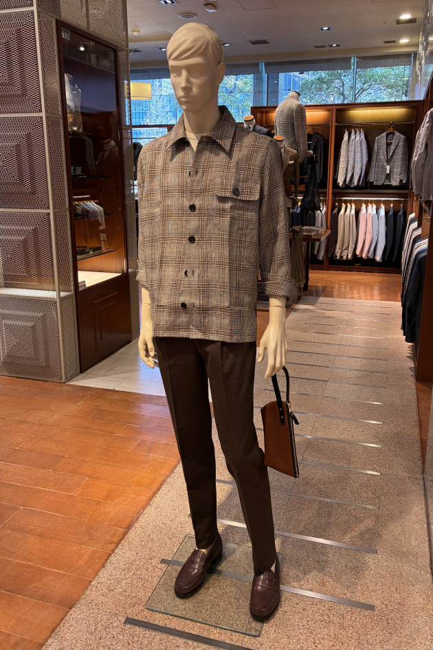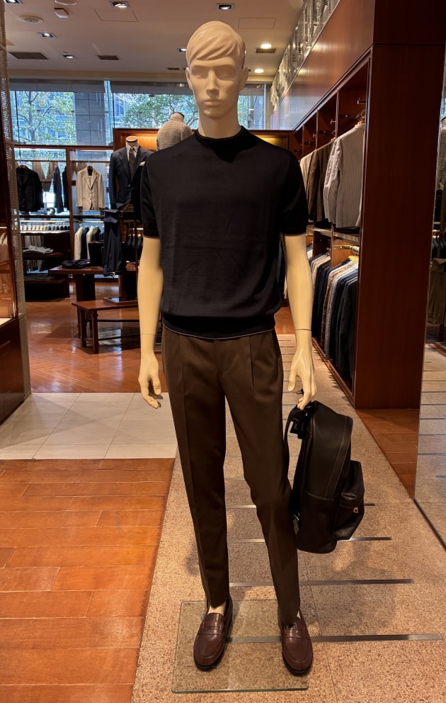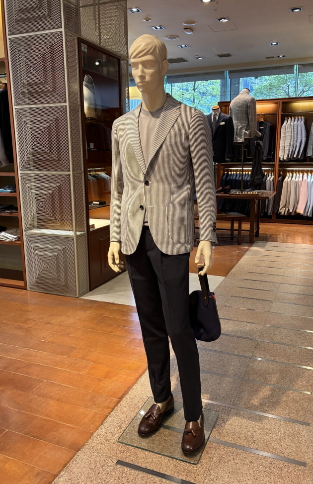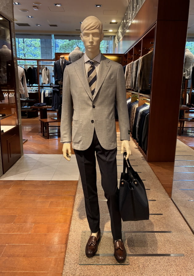 こちらは店内のディスプレイで使用していた上半身をそのまま流用しました。ディスプレイはウールのグレースラックスでしたが、爽やかな色柄のジャケットにはコットンのネイビースラックスも良いと思います。