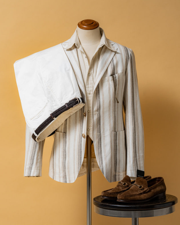 ジャケットのオルタネイトストライプの中にグリーンっぽさのあるグレーが入っているので、シャツは同系色でなくグリーンのポロシャツでも相性の良い組み合わせになります。