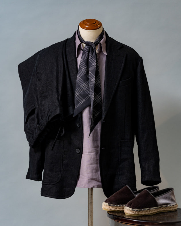 ピンクのネッカチーフはルック的な差し色でもあるので、こちらを外した着こなしもリアルクローズな印象となりおすすめです。