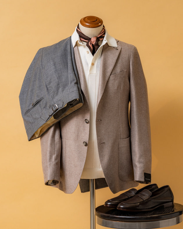 ジャケットは<TAGLIATORE>、シルクをブレンドさせることで光沢感があり上品な仕上がりとなっています。