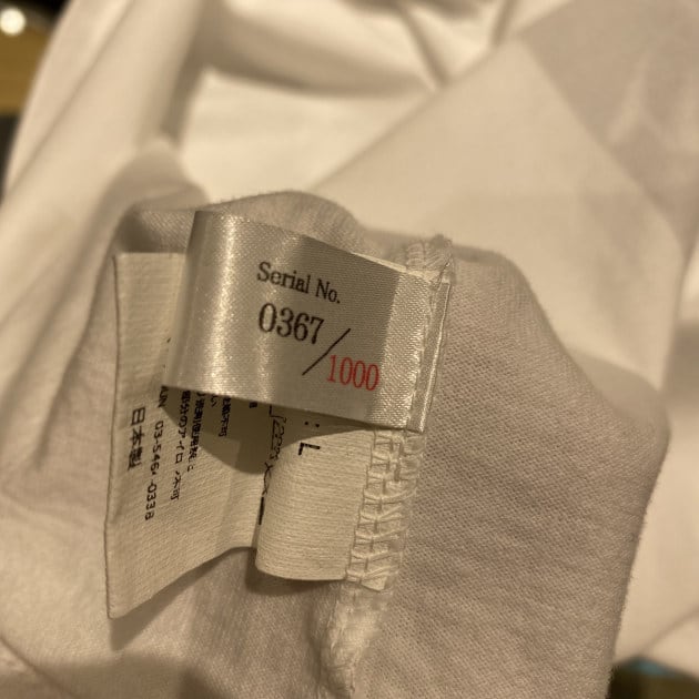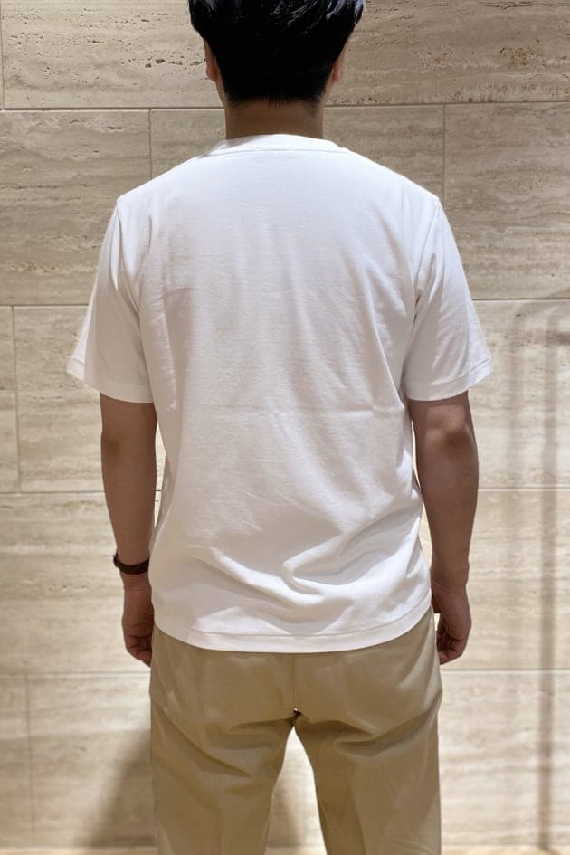 背面に立体的なブランドロゴが施されたシンプルなクルーネックTシャツ。