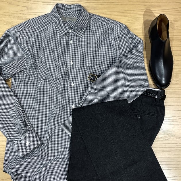 ギンガムチェック柄でデニムとブーツの武骨な印象を中和させた着こなしは、主張が強くない"さりげなさ"がポイントに。