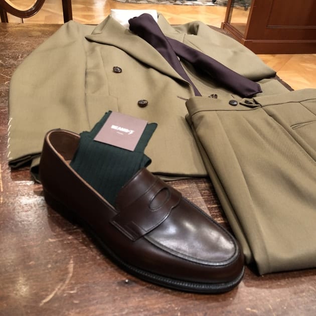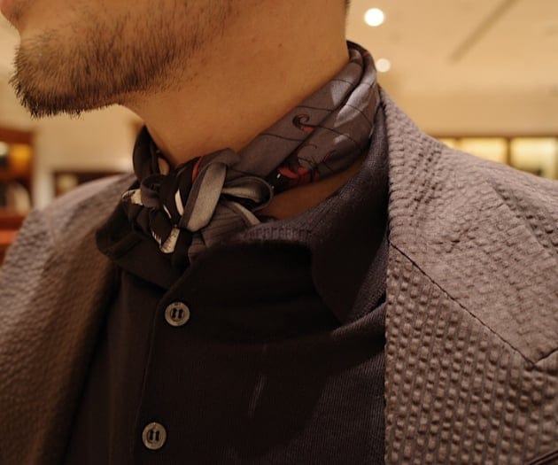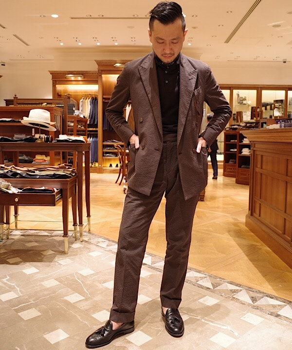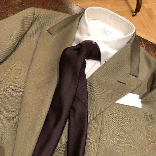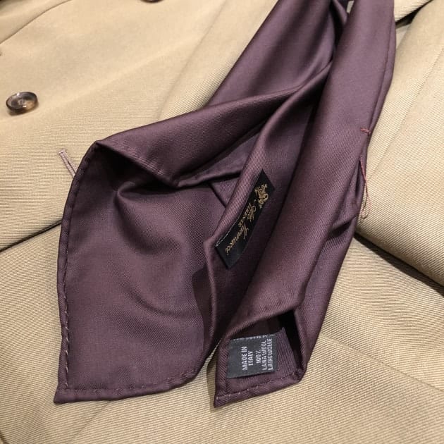 説明すると恥ずかしいのですが、持ち手のレザーの色とポケットチーフの色をリンクさせてます。