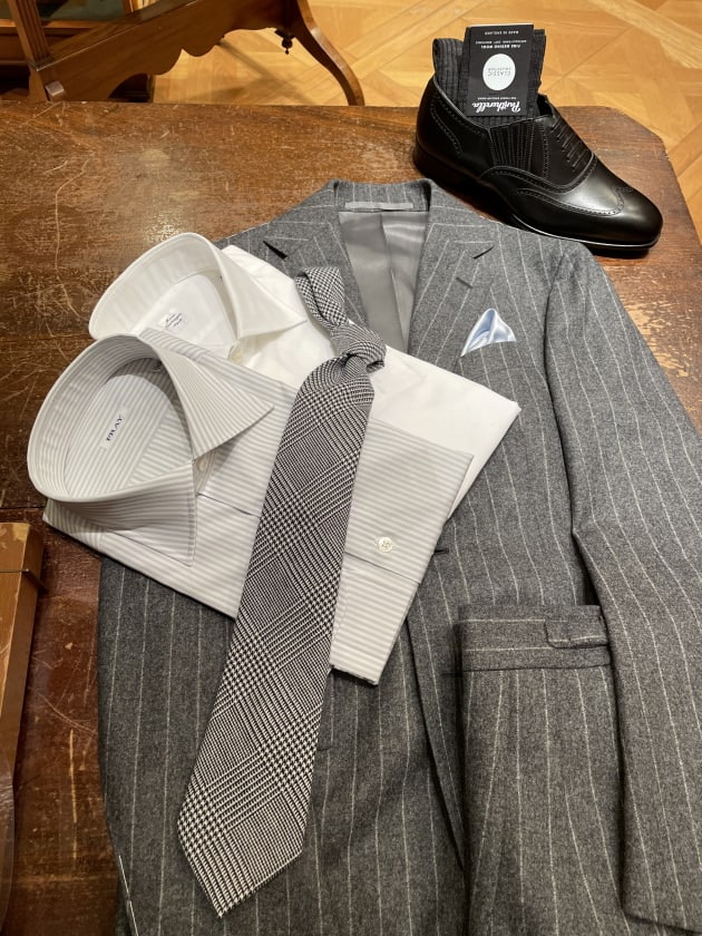 本来は王道の合わせですので何も問題はないのですが、ビームスらしいこなしと今の時代感を表現するためストライプタイの選択になったとのこと。