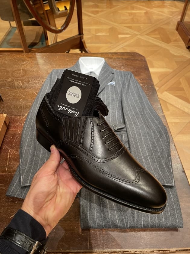 そして足元はVゾーンがこの色合わせですので自動的に茶靴になりますね。