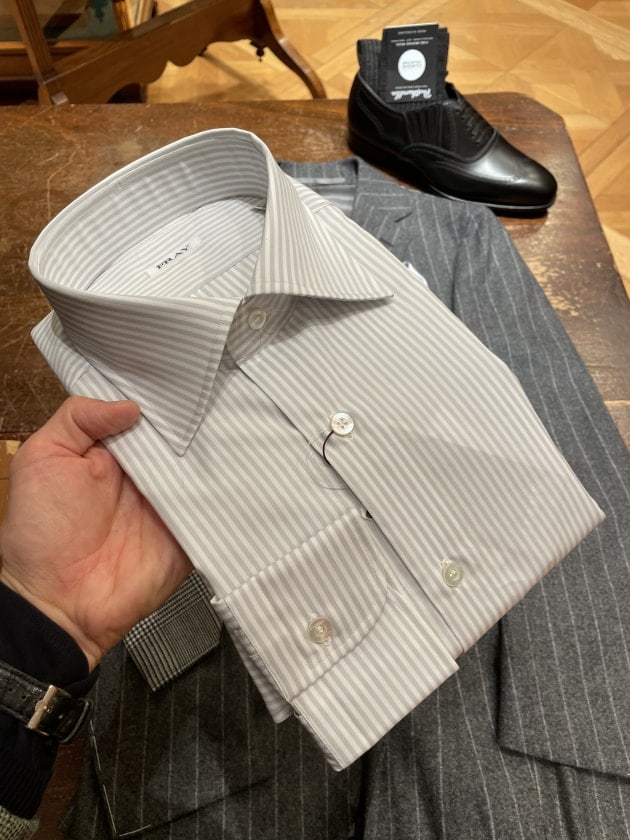 〈FRAY〉のロンドンストライプ セミワイドカラーシャツに、
