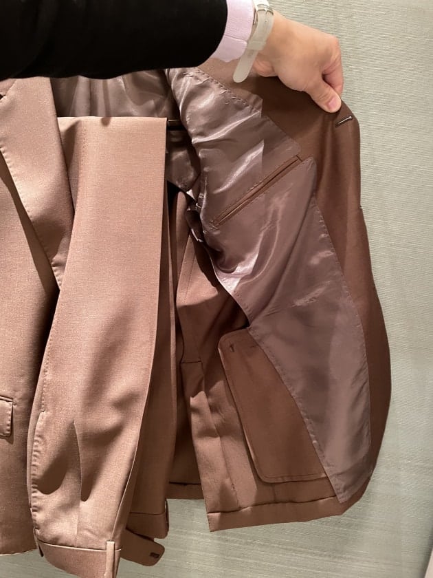 モヘア混生地の特徴でシワになりにくい、タッチがさらっとしているというメリットがあります。総裏仕様ですが、今から来年の3月上旬頃まで長く着ていただけます。