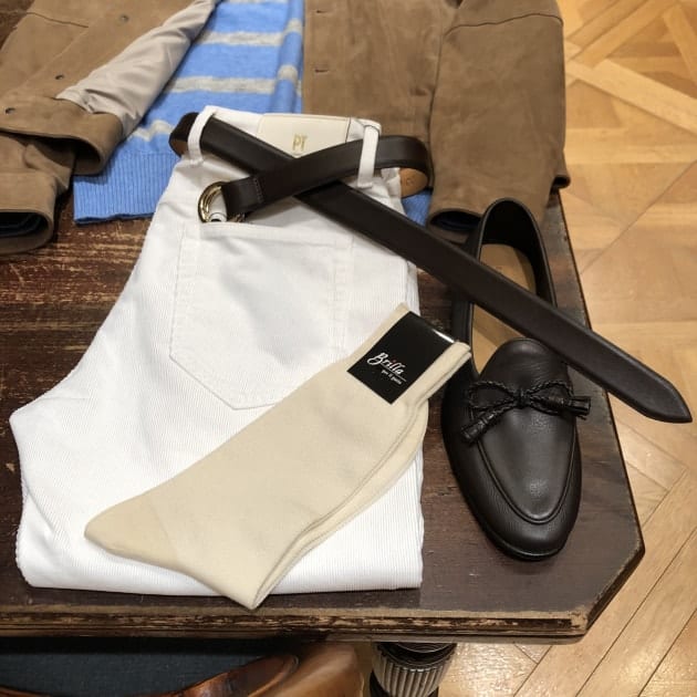ニットポロとベルジャンシューズでリラックス&ラグジュアリー感をイメージしてみました。
