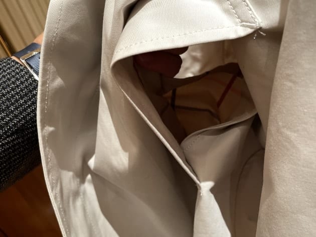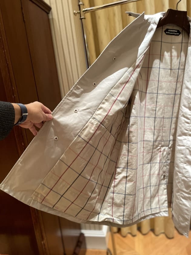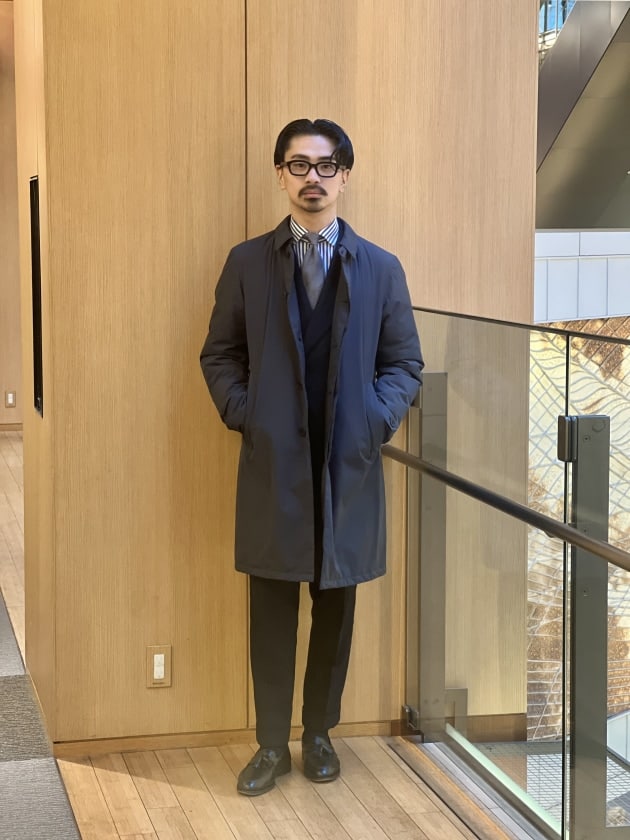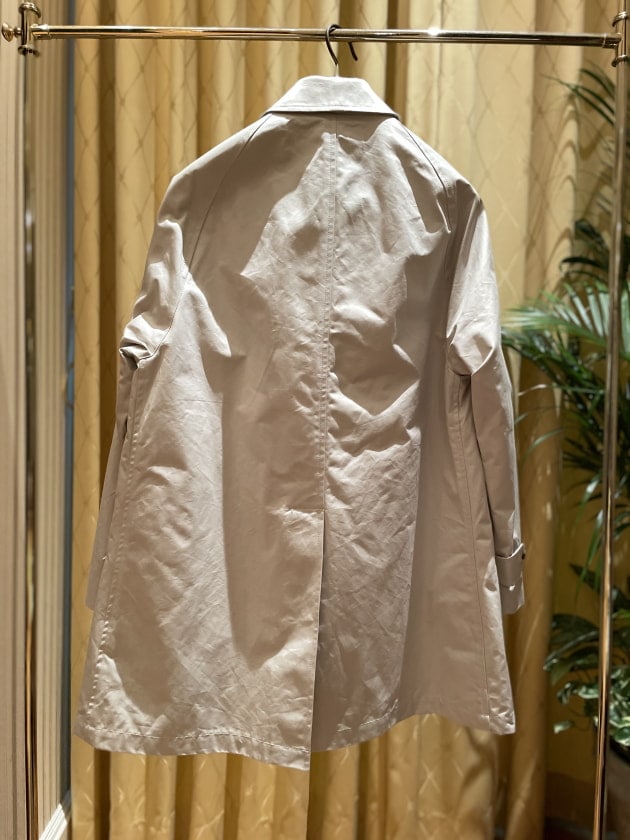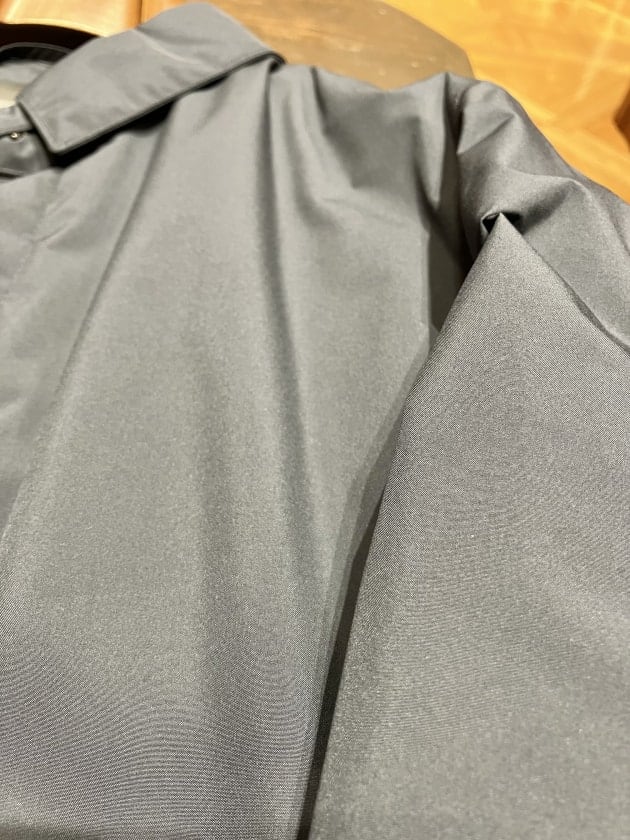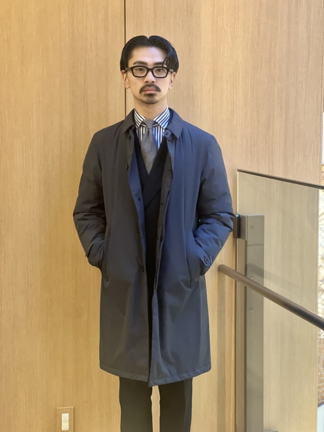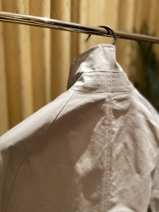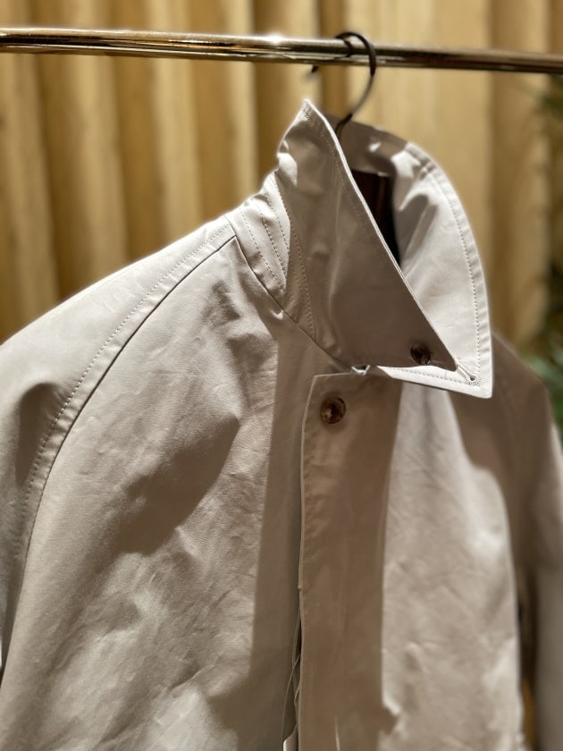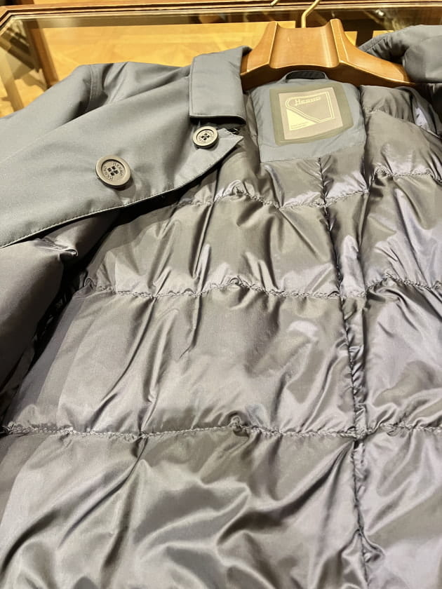 裏地は透湿防水機能を備えた2層構造で、控えめながら充分暖かく着て頂けるようダウンも内蔵した作りのステンカラーコートが本日の主役。