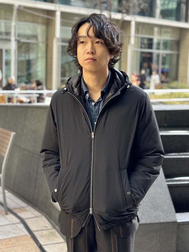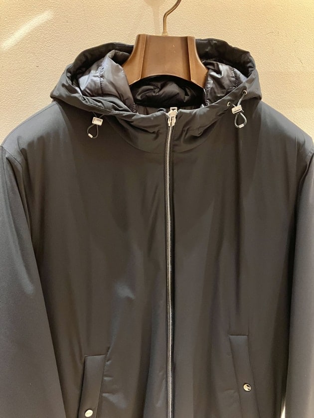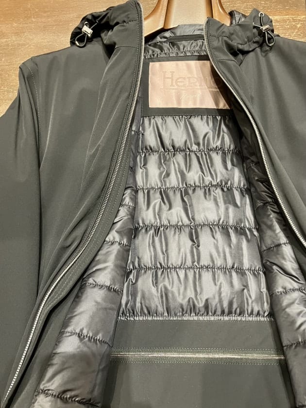 持っていて間違いがない<HERNO>の定番モデルです。ファブリックは超軽量の撥水ナイロンを使用しているので、デイリーユースにピッタリの1着。