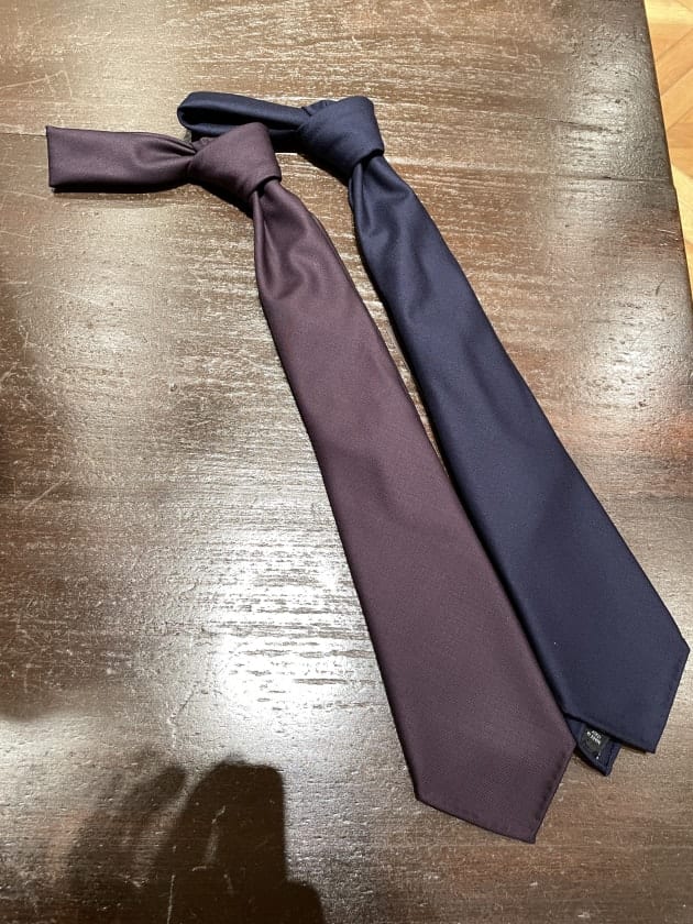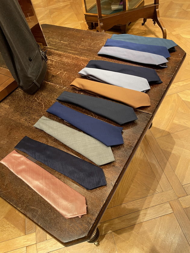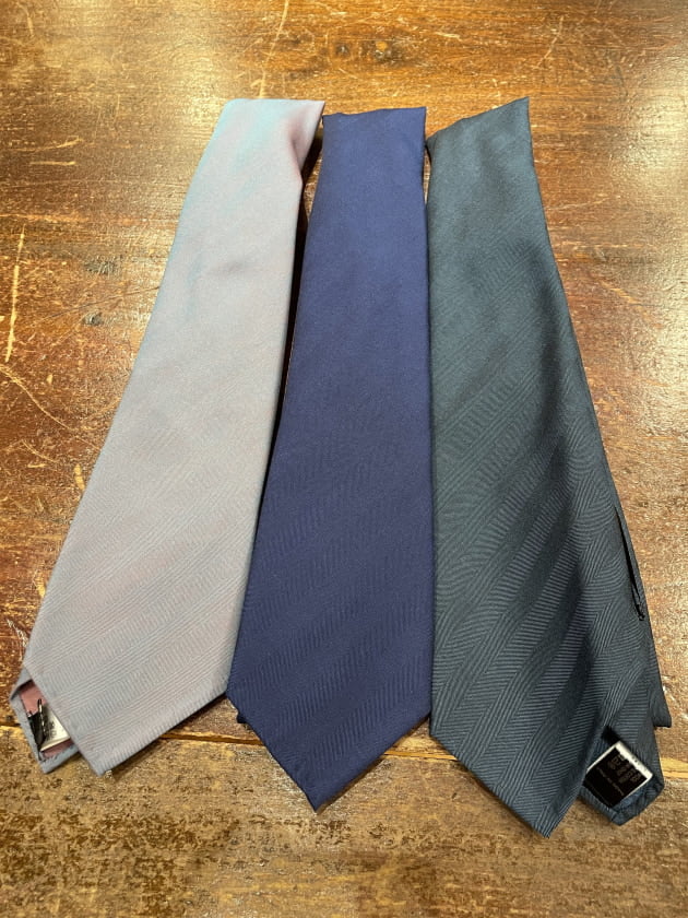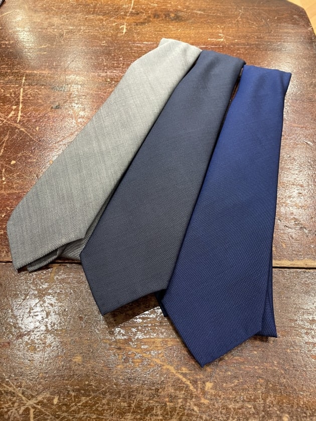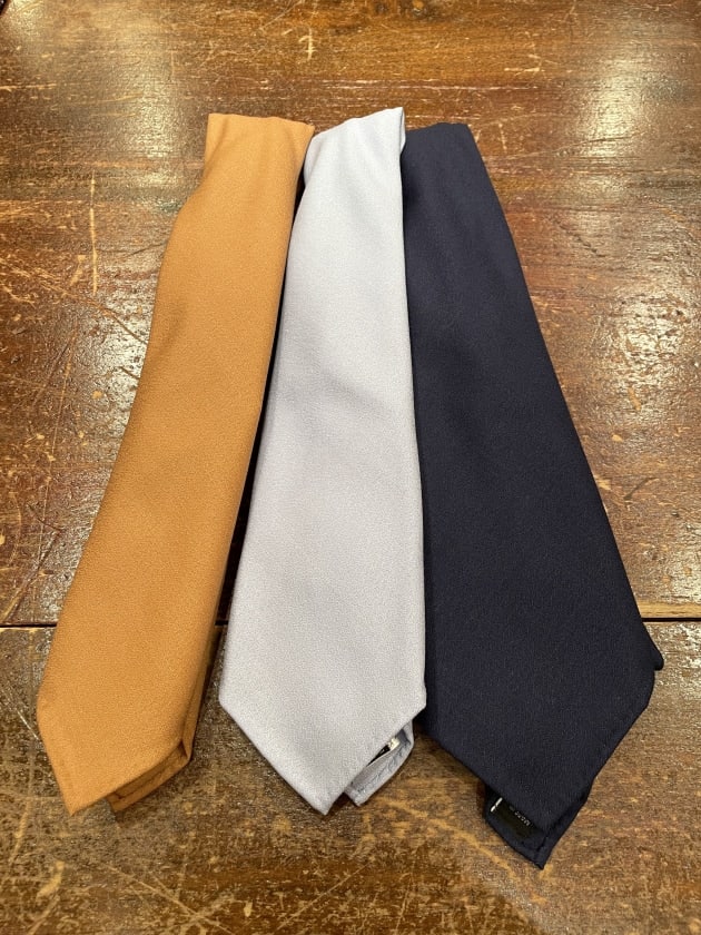 三色とも<Atto Vannucci>の7つ折りネクタイを合わせてみました。生地感がスーツとうまく合いますね。