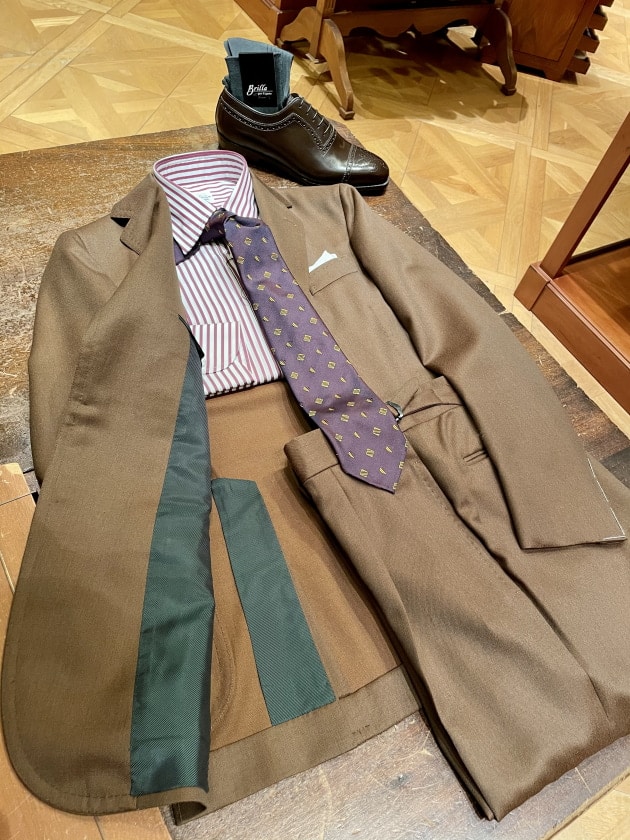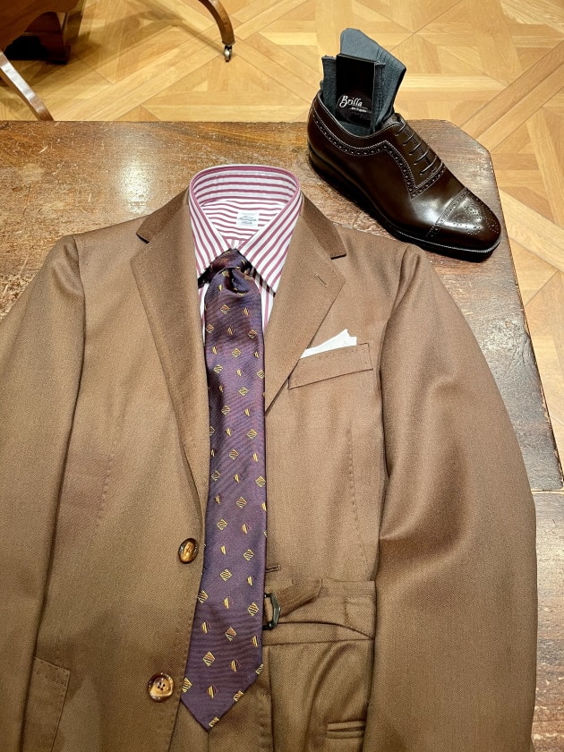 同じくイタリアを代表する〈Stile Latino(スティレ ラティーノ)〉のダークベージュのコットンスーツにベージュのレギュラーシャツを挟んで合わせてみたらカッコイイかなと…。