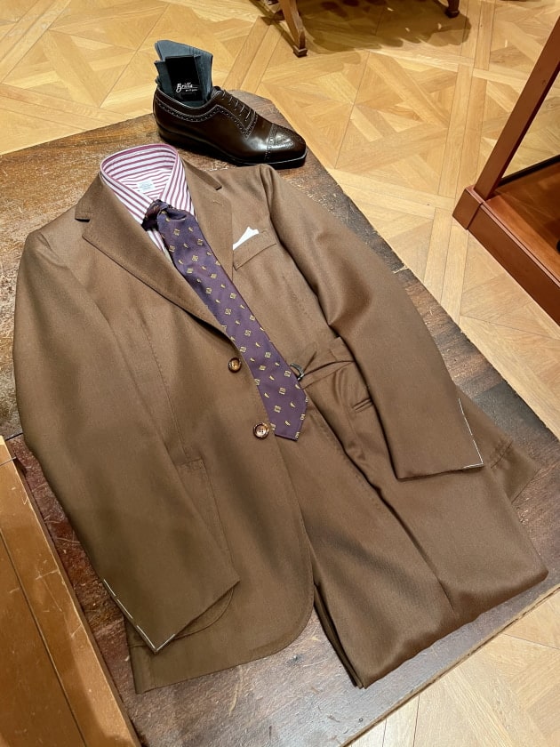 前からお伝えしてますが、背抜き仕様で生地も薄手のこのスーツは春夏も着ていただけます。
