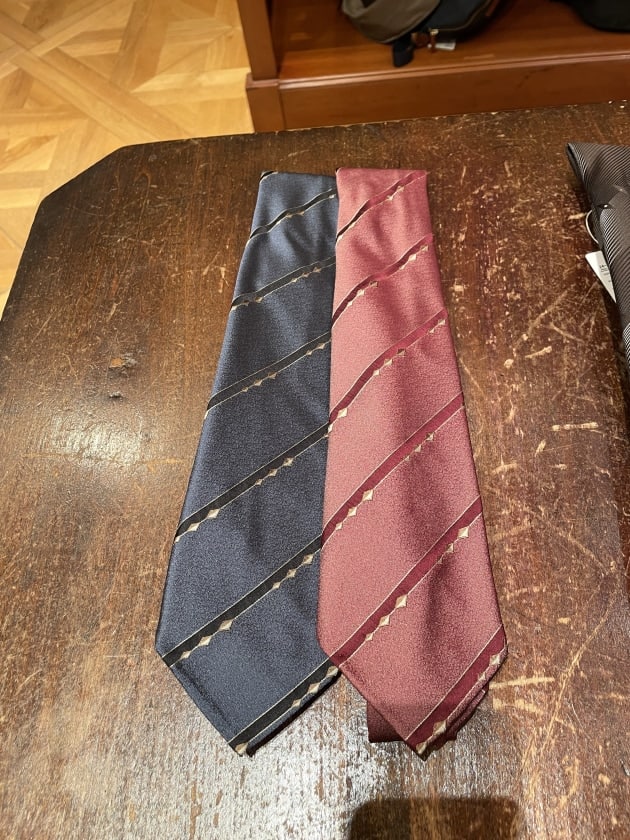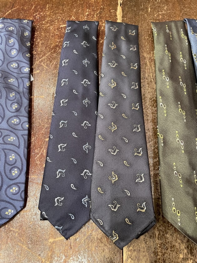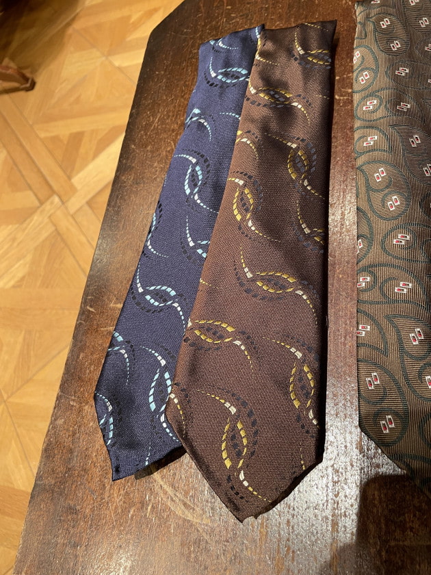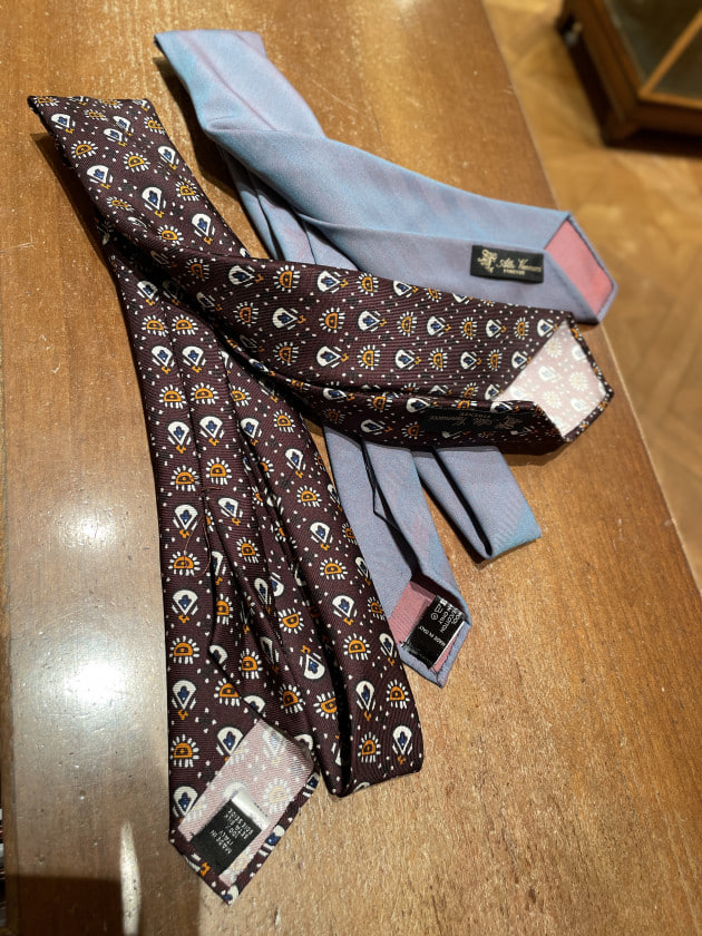 ヴィンテージ調のストライプネクタイをピックアップ。ここ最近は他のブランドも含めて割とスタンダードなストライプ柄ばかり…。そんな中で個人的にも刺さる配色と柄パターンのネクタイが入荷して参りました。