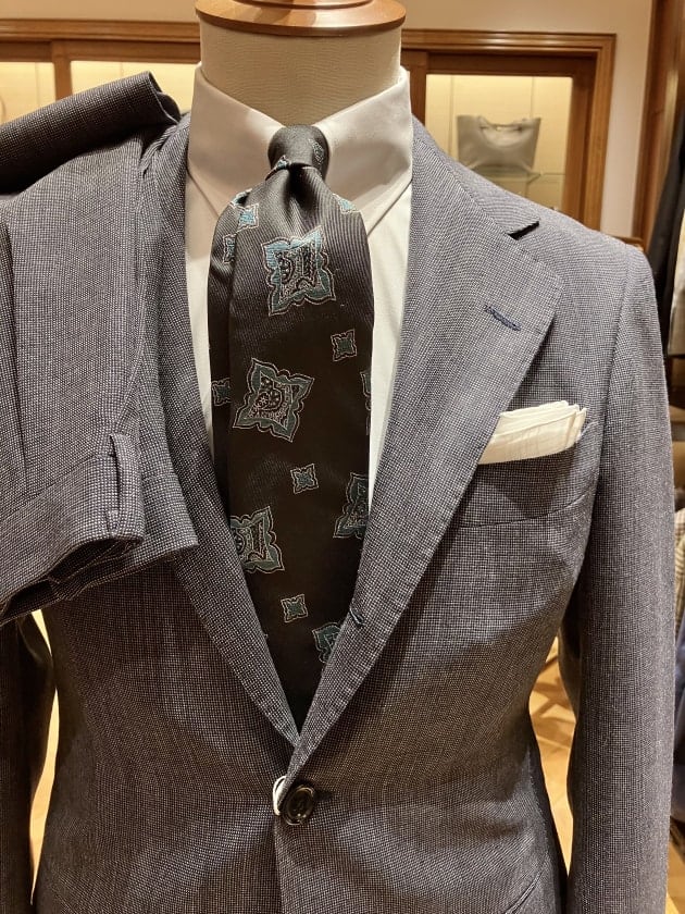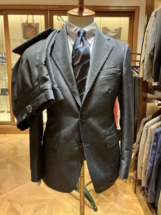 今回は敢えてコーディネートは載せておりません。スーツの王道である「ネイビースーツ」なので、様々なコーディネートに相性よく使って頂けるかなと思います。