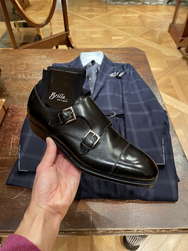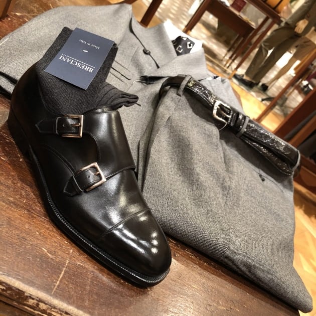 ダブルモンクストラップシューズにグレーのロングホーズ。