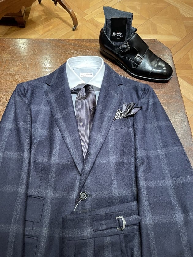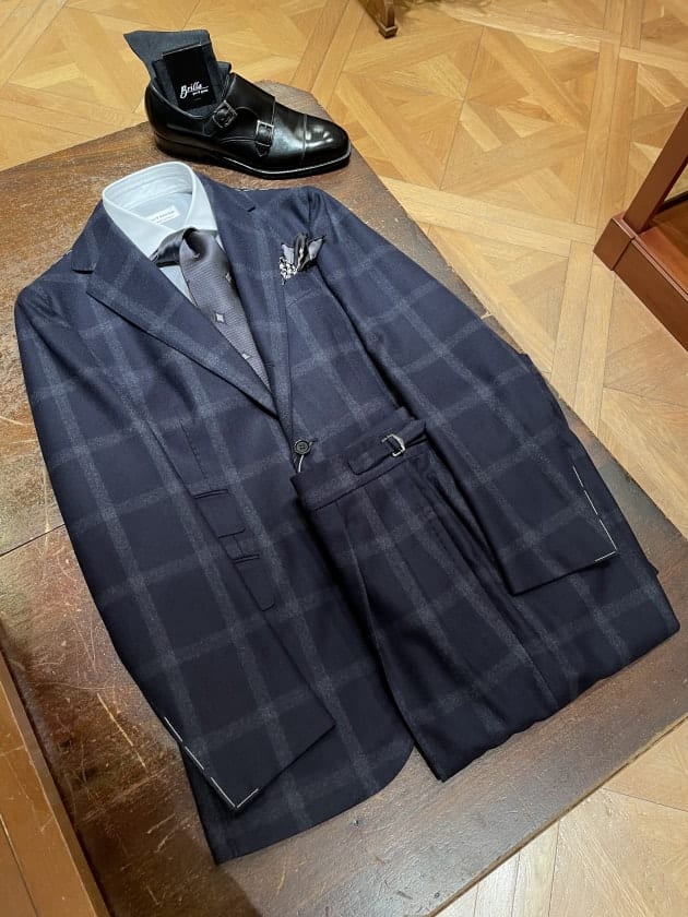 ネイビーに少しぼやけた太めのウインドウペーンが印象的なスーツです。