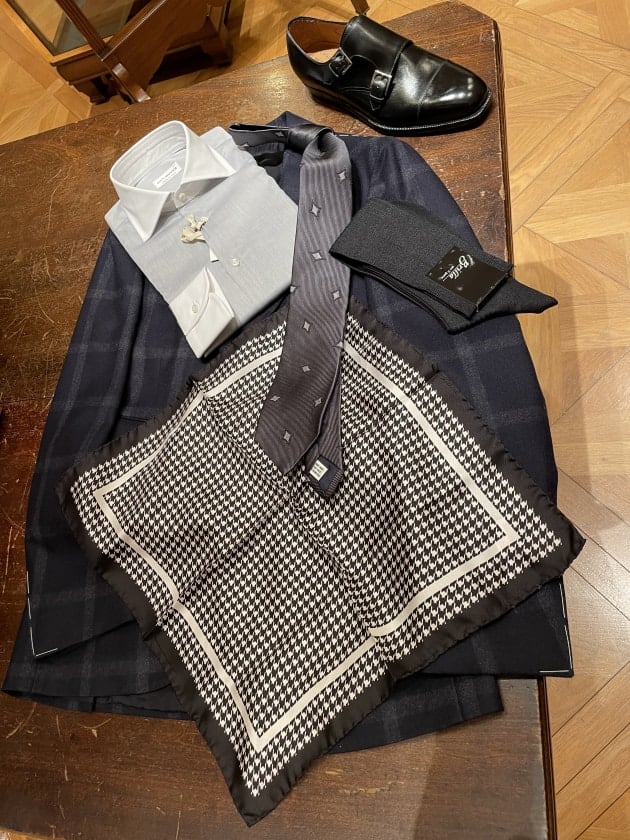 シャツ、タイ、チーフをセットで購入してはいかがでしょうか?お手持ちのグレースーツやネイビースーツにきっと合います。
