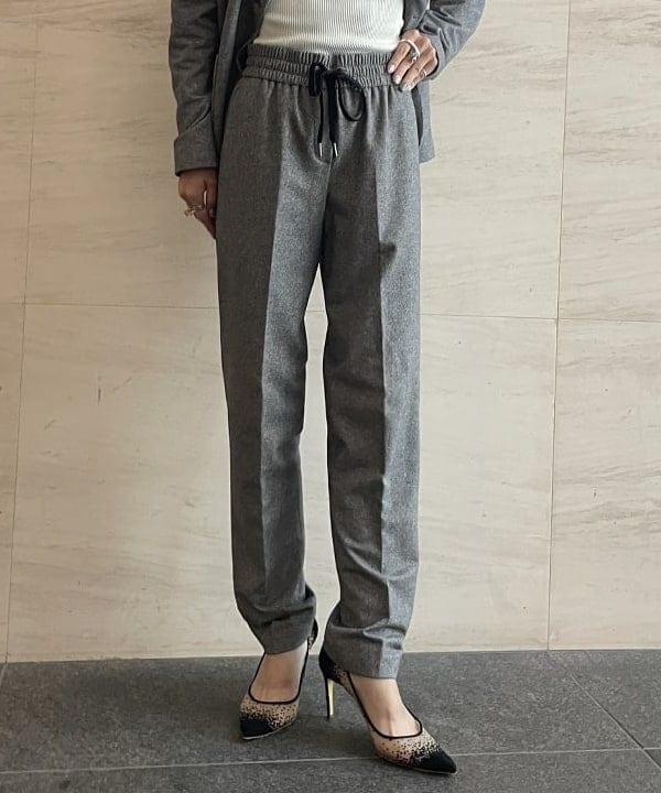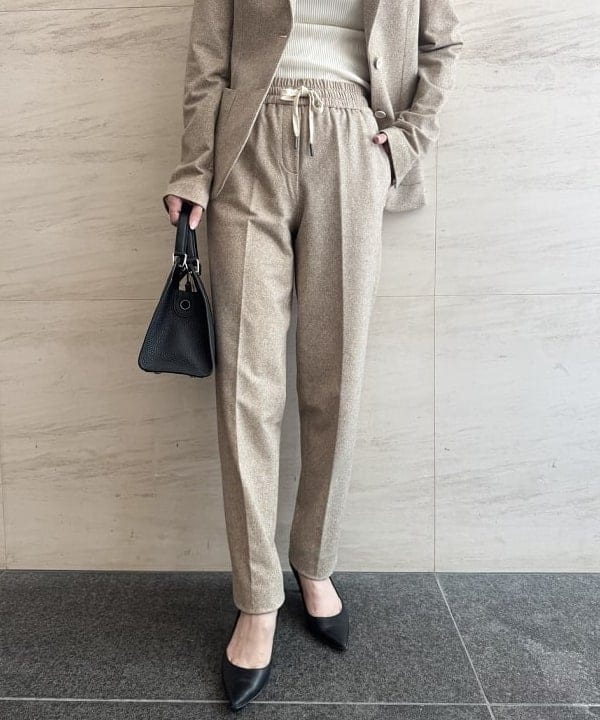 共地を使ったスラックスは腰回りのスッキリとしたノープリーツで、
