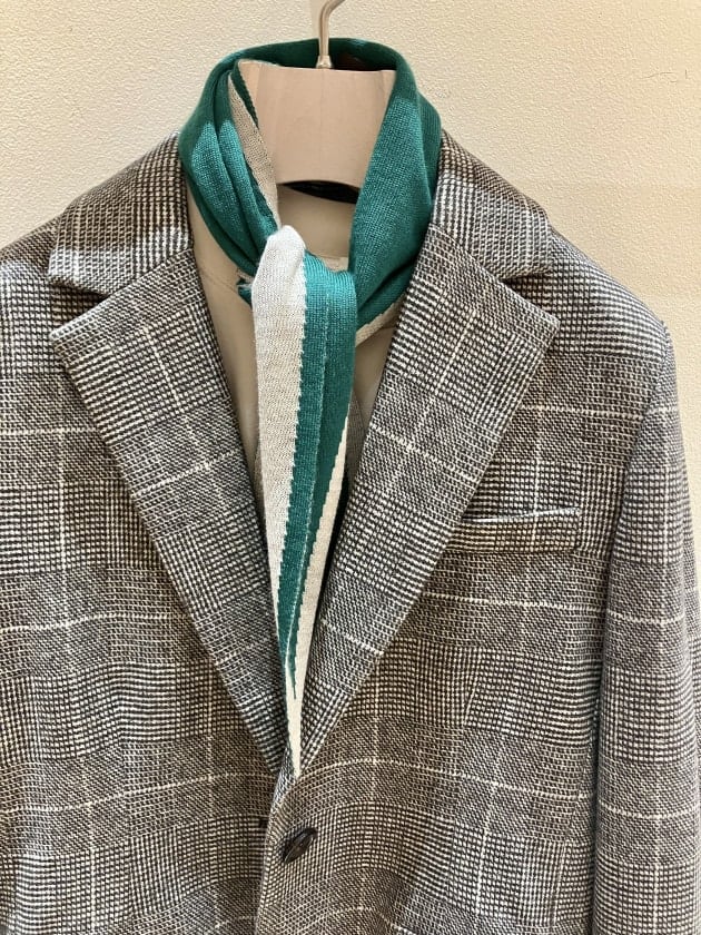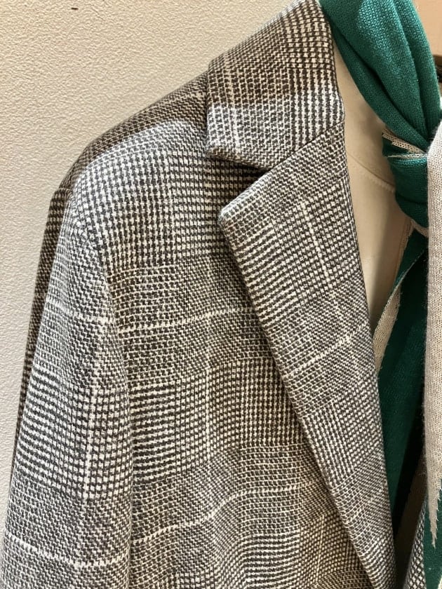 本来ジャージー素材も含めた柔らかく伸縮性ある素材だと、なかなか綺麗なシルエットに仕上げにくくなるという点がありながら、ラペルもキレイに返っていてメリハリのある美しくも体のラインがスッキリと見えるシルエットに仕上げる。
