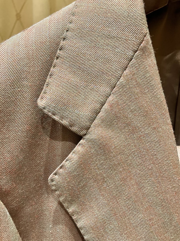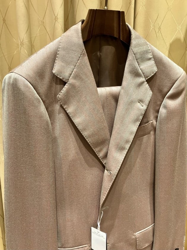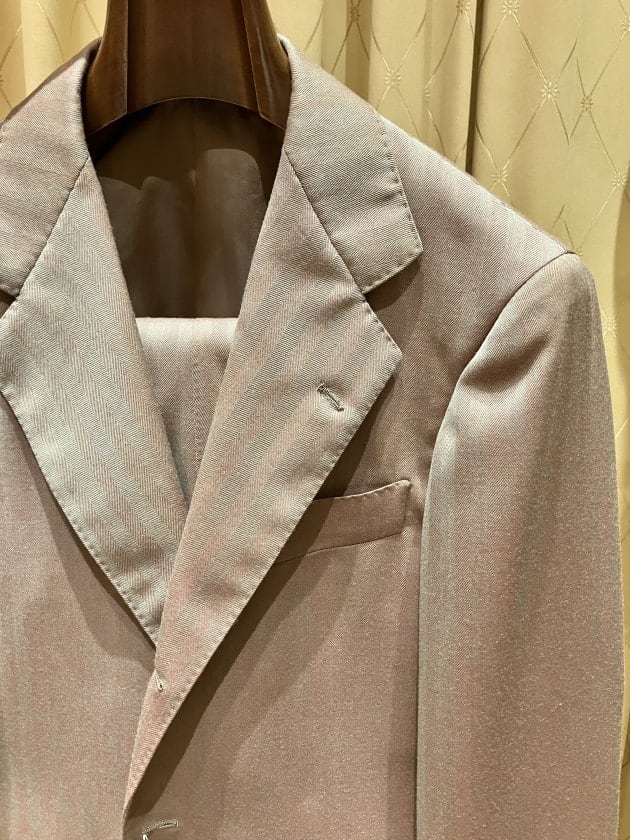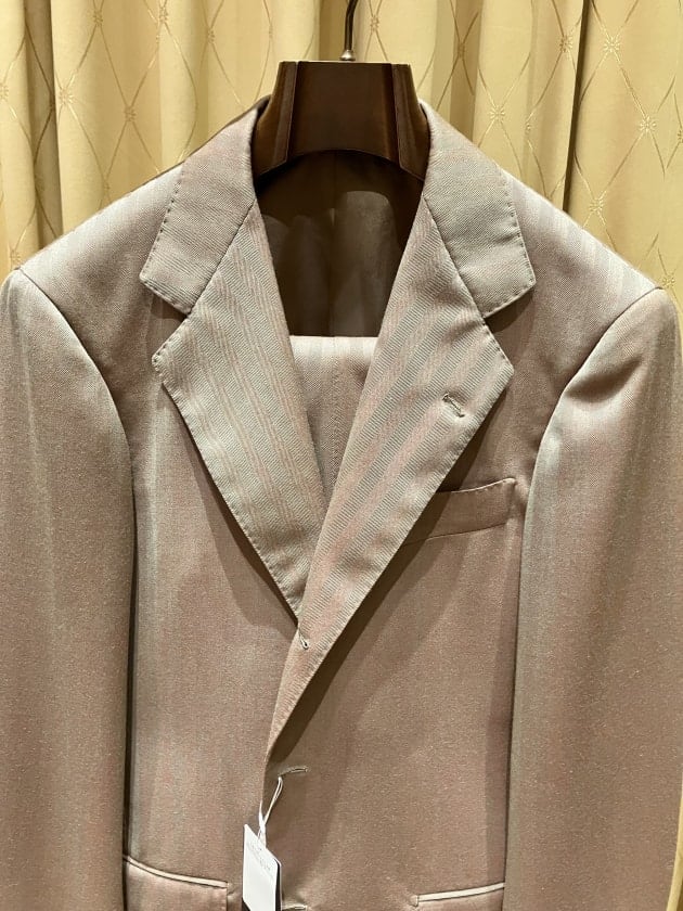 またスーツのゴージラインの傾斜に合わせてレギュラーカラーシャツという点もポイント。