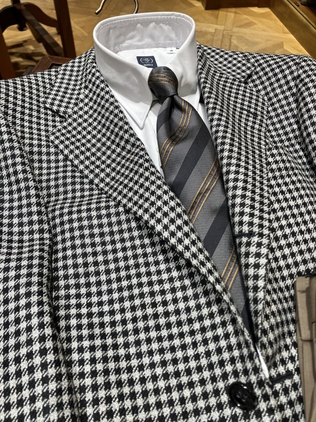 以前展開していた、〈BEAMS F〉オリジナルのグレーのスーツに、ネイビーのロンドンストライプシャツとネイビードットタイというストレートな合わせ。