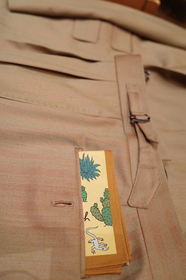 ちなみにどうでもいい話なのですが私はハンカチをパンツお尻の左ポケットに入れる派で、人気の高い〈IGARASHI TROUSERS〉でオーダーしたパンツのお尻のポケットは左のみ。