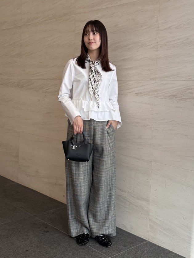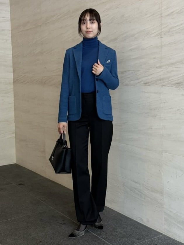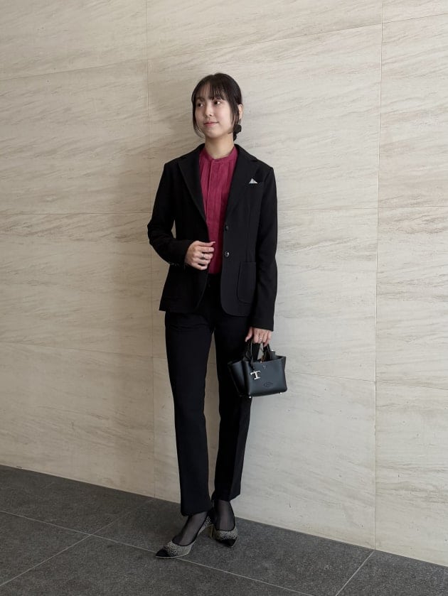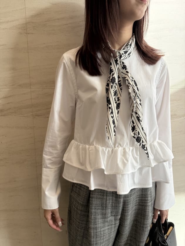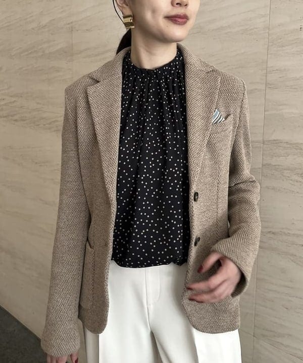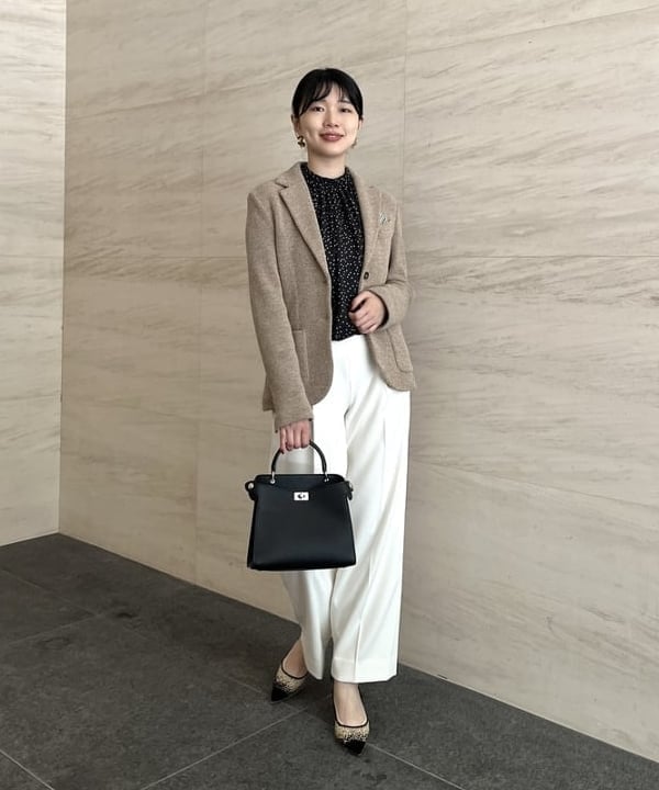 スタッフ鈴木はベージュカラーのジャケットをプリントのブラウスと合わせることでフェミニンなコーディネートに。
