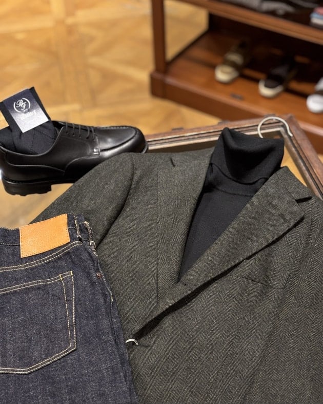 ジャケットの色味が主役級ですので、ニットとデニムパンツはシンプルな色と形をチョイスしております。